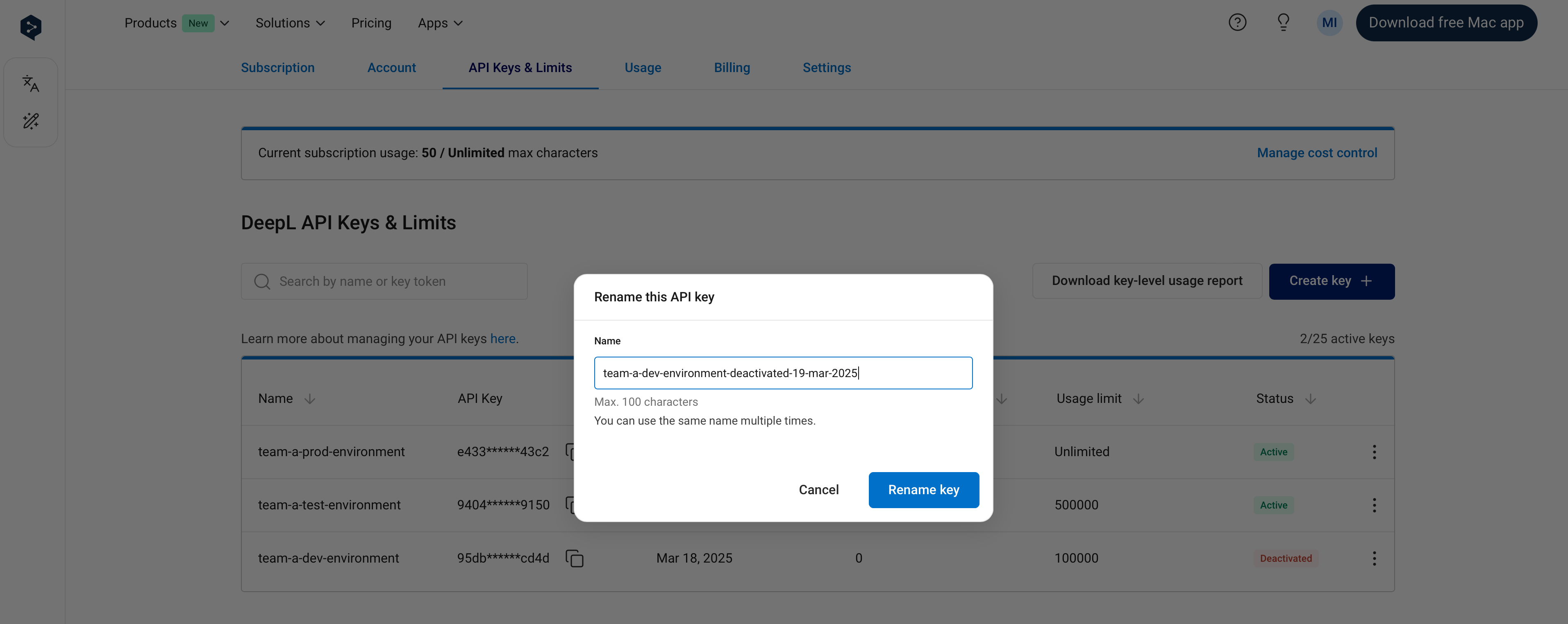 It’s possible to set an API key-level usage limit. Key-level limits restrict the number of total characters (across text translation, document translation, and text improvement) that can be consumed by an API key in a one-month usage period. You can see the dates of your current usage period in the Usage tab. For example, if you set a key-level usage limit of 1,000,000 characters, the API key will not consume more than 1,000,000 characters per usage period. In the “API Keys & Limits” tab, the “Characters consumed” column in the API keys table shows the number of characters consumed by an API key in the current usage period. The character count will “reset” at the start of the next usage period, at which point the key will again be able to consume characters. As with subscription-level cost control:- You’ll receive notification emails when 80% and 100% of a key-level limit has been reached